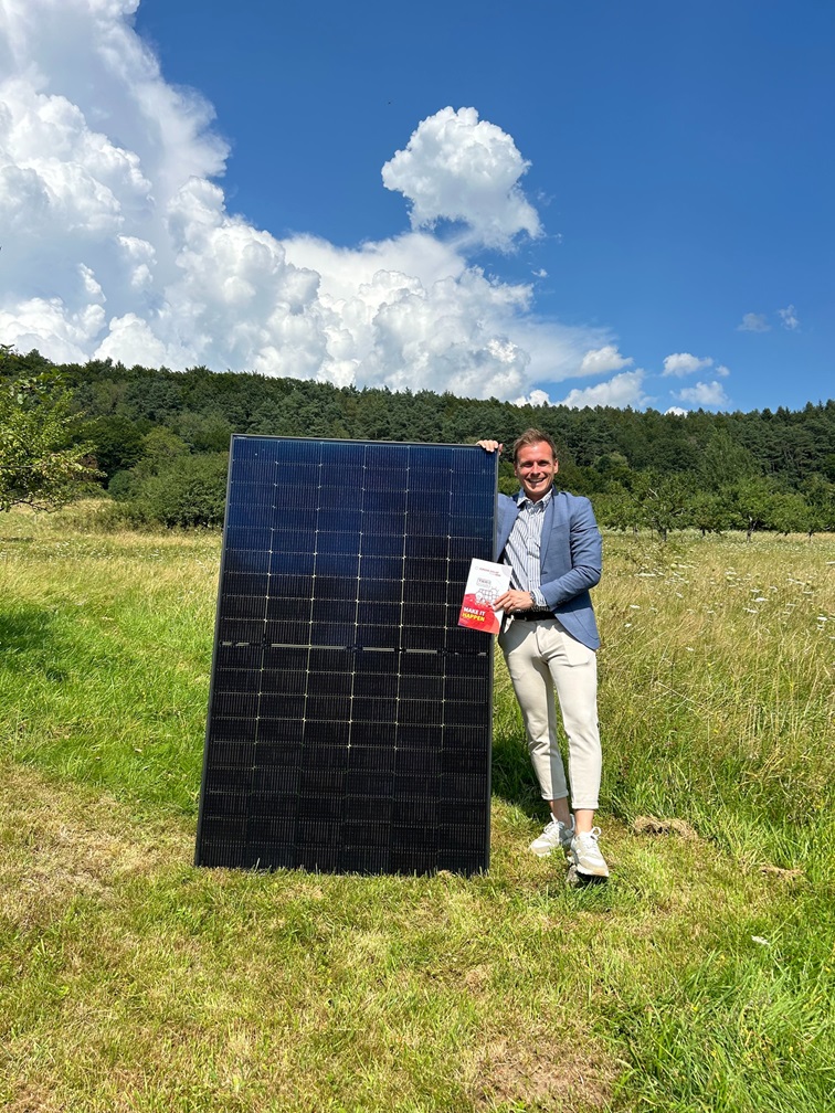 Der Gründer von Pesasun, Christian Bittner, zeigt das gerade eingretroffene Sunova / Thornova Solar PV-Modul.