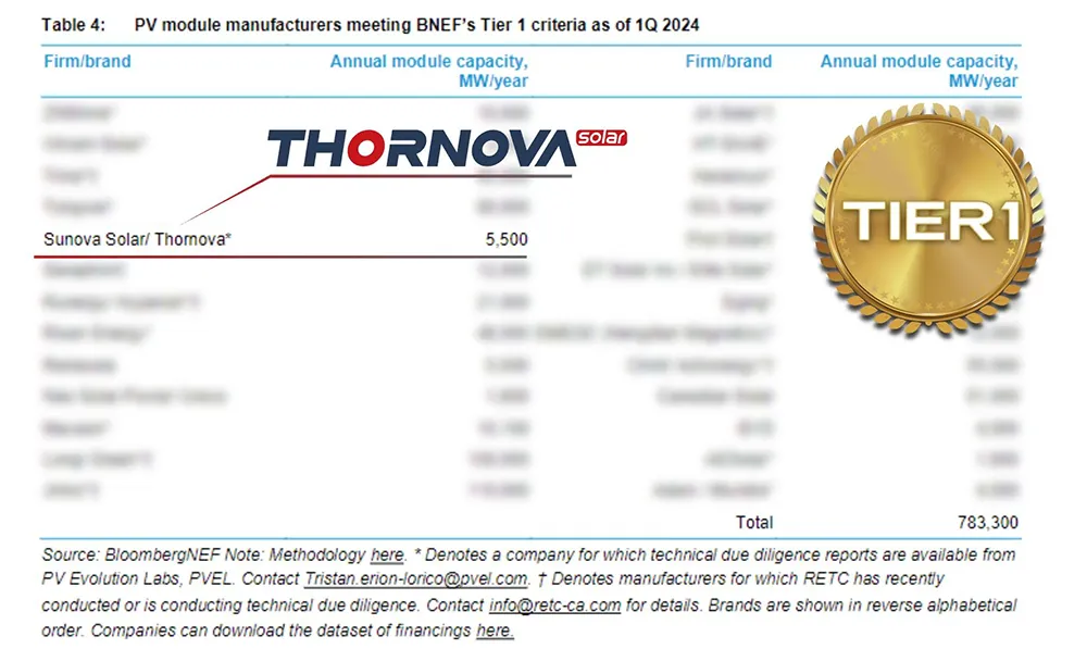 In the First Quarter 2024 Bloomberg New Energy Finance (BNEF) report, Thornova continues to rank as a Tier 1 module manufacturer, despite the stricter requirements as of January 2024. While 43% of module manufacturers were removed from the list, Thornova and its parent company, Sunova Solar, maintained their standing.