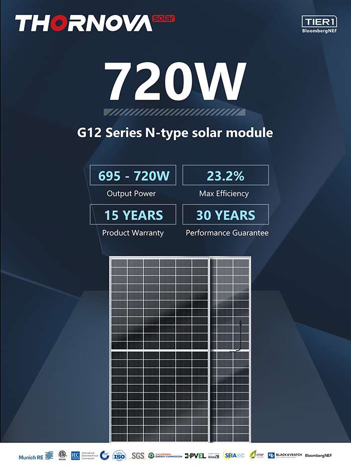Thornova G12 series 720W modules leverage the core advantages of Thornova N-type modules in terms of higher efficiency, power output, and reliability. N-type solar cells, devoid of boron-oxygen pairs, virtually eliminate Light Induced Degradation (LID) when compared to PERC solar cells, resulting in a remarkable reduction of power attenuation to approximately 0.15% in Thornova 720W modules, significantly lower than the 1.35% attenuation seen in PERC modules.
