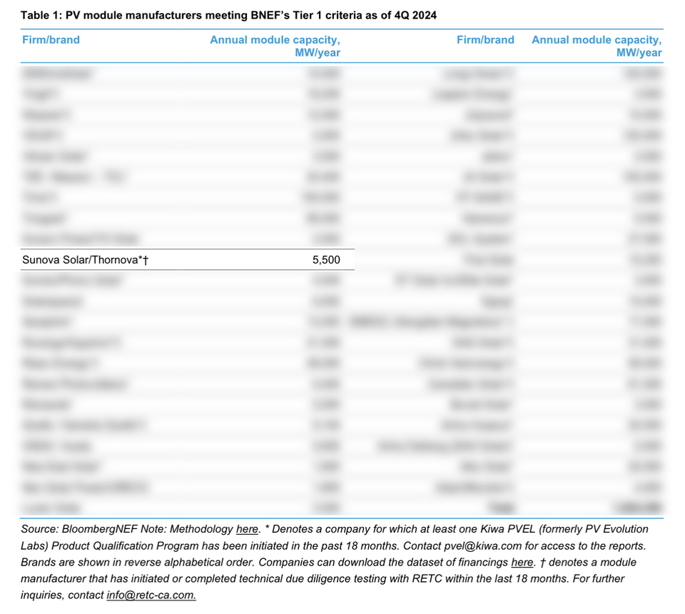 In its 4th quarter 2024 report, Bloomberg New Energy Finance (BNEF) continues to list Thornova / Sunova Solar as a Tier 1 module manufacturer.